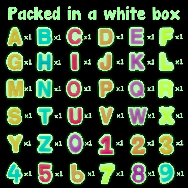 - What’s in the package - Package comes with 36pcs glowing shoe charms, include 10pcs number 0-9, 26pcs letter A-Z, all packaged in a white box. The product is made of lightweight & soft PVC (rubber), safe and non-toxic, colorful and stylish as shown, fitting your shoes well.