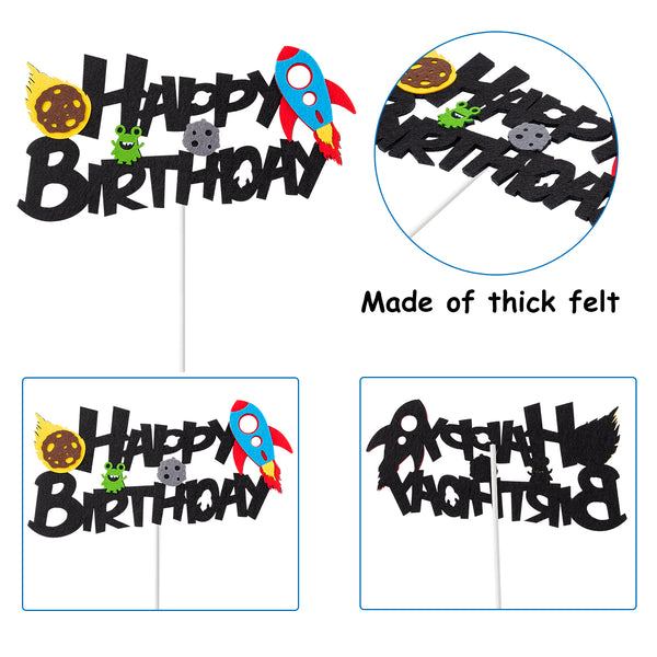 - Package - Contains 1pc of big felt happy birthday cake sign topper; 48pcs cake pick which are printed with space related patterns; 1 sheet of glue dots. This set is very suitable for kids’ birthday party, baby shower, space theme party, astronaut party, alien party, etc.