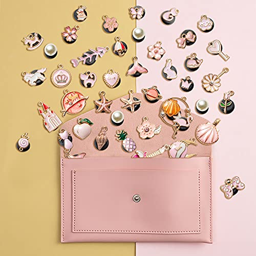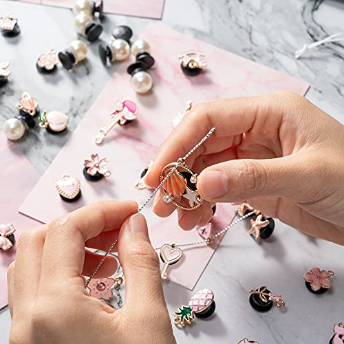 - What's in the package-The package contains 40 pink enamel themed shoe charms; 10 beautiful pearls, all in a white box. The product is made of metal, as shown in the picture, with bright colors, fashion, and easy fit to your shoes.