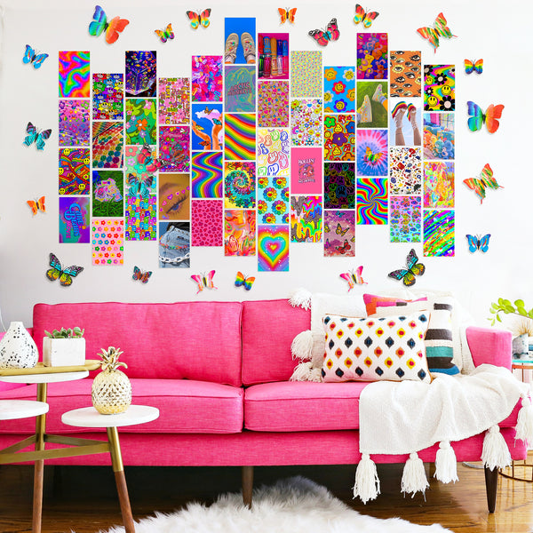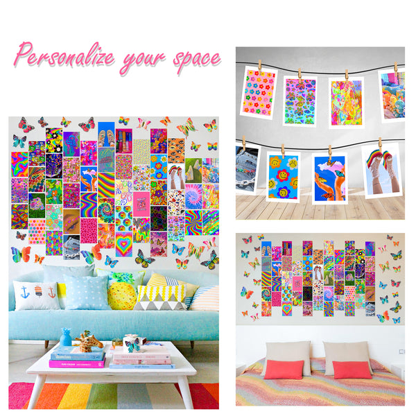 - Kit Include: Contains 50pcs 4x6 inch bright color aesthetic pictures, 12pcs double layer colorful simulation butterfly. You can make great use of a small space with these creative wall collage display.