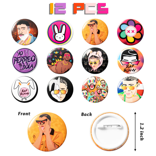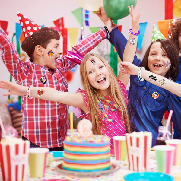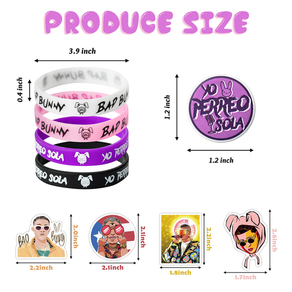 Party Kit : Package contains 12 silicone bracelets wristbands with 4 colors, each color has 3, 12 different patterns pins badges, 50 stickers.