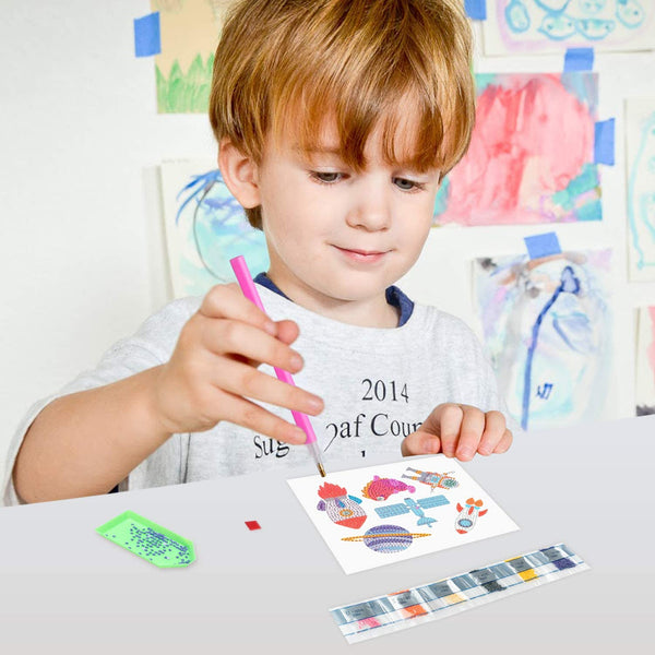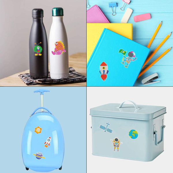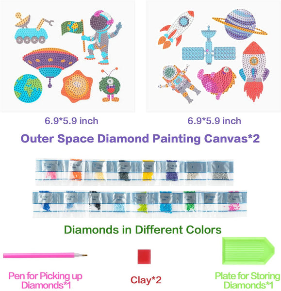 - Package - Contains 12pcs outer space themed diamond painting stickers. Tools: 1 x instruction, 1 x glue clay, 1 x sticky pen, 1 x green dispensing plate, different colors’ diamonds. This kit is suitable for kids’ birthday gift, space theme party, astronaut party, alien party, etc.