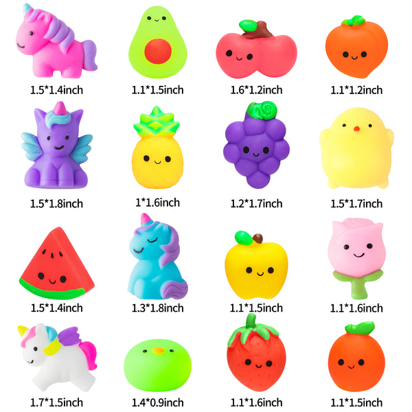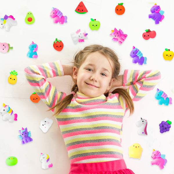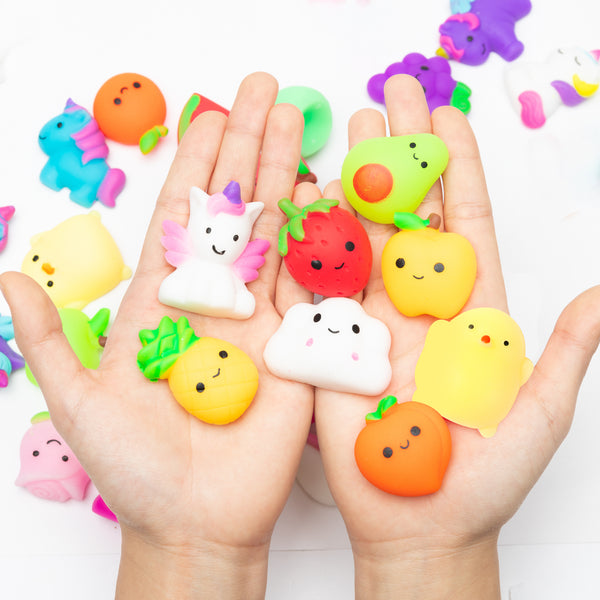 - Kawaii toys: Contains 27pcs cute squeeze toys in various shapes and sizes from cute unicorn to delicious fruits items. They are in good size to be handy so that you can bring them anywhere.