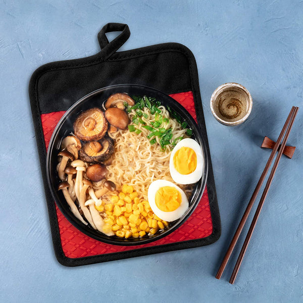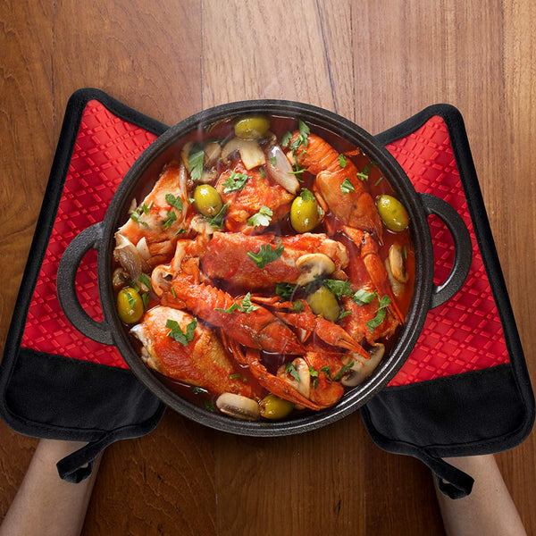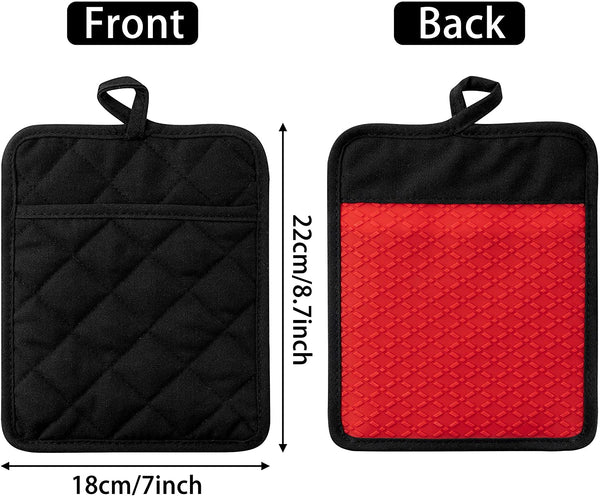 - Non-slip and Durable: The GROBRO7 potholder is made of cotton cloth and silicone. It has black cotton cloth on one side and red silicone on the other side, and measures 7 x 8.7 inches. The silicone material can make the potholder have a non-slip effect. It uses a simple and stylish design, with pockets and strong heat resistance, you can use it for a long time!