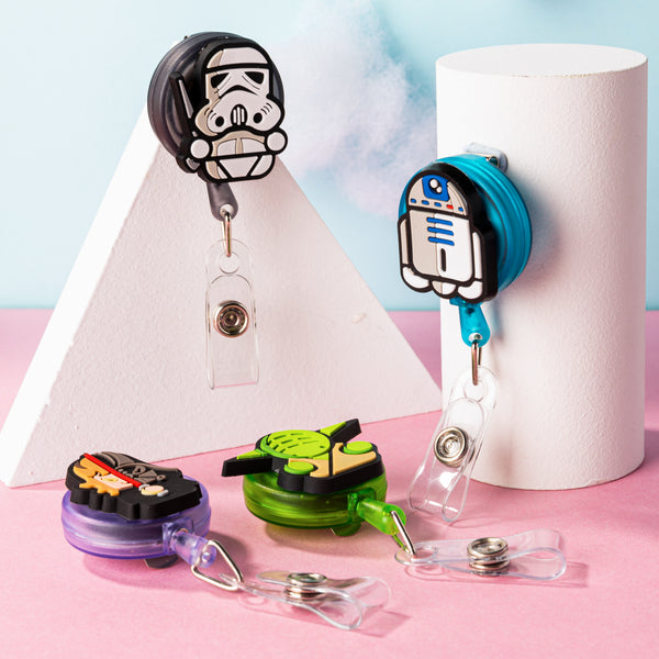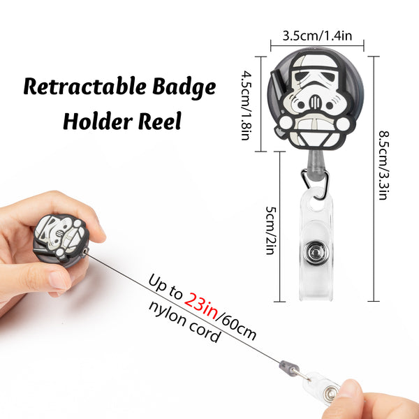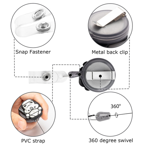 Package - Contains 4 galaxy wars badge holders, 4 different patterns totally. There is a metal back clip, a snap fastener and a 360 degree swivel on each badge holder. The retractable nylon cord can be up to 23 inch/ 60cm’s long length.