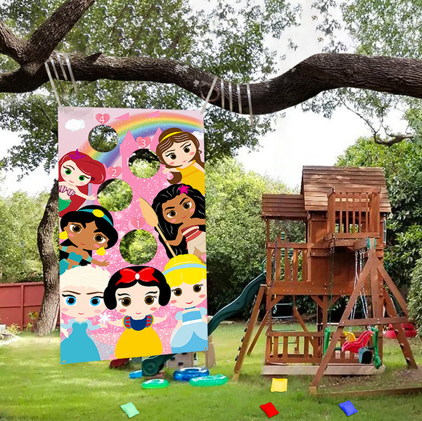- [Package Includes] Let Princess delight your party! Package comes with Princess printed durable satin game banner*1, bean bag*4 (red, yellow, blue, green) for tossing, a rope (approx.19.68 ft) for hanging.