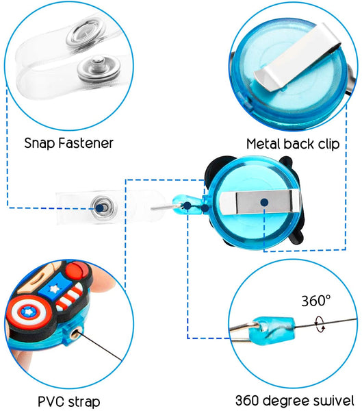 What is in? - The set has 4 superhero badge holders, include Spider Superhero, Captain, Green Giant, and Iron. Each holder has a metal back clip, snap button and 360 degree rotation.
