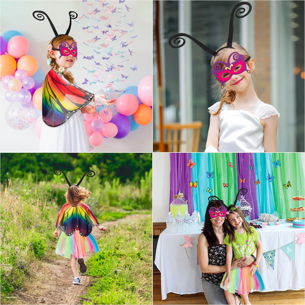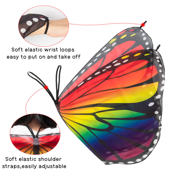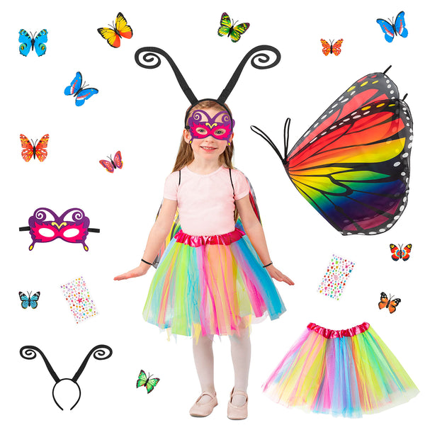 - - Value Package - 18PCS butterfly wings costume, which include butterfly wing*1, rainbow tutu*1, mask*1, black butterfly antenna headband*1, two sizes of small simulated colorful butterflies, each size*6, one diamond sticker each for love and stars.