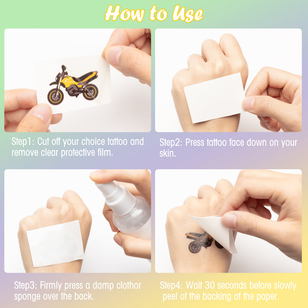- - Tips for Tattoos - Our dirt bike themed temporary tattoos are made of non-toxic material. And the usage method is attached in the picture.
